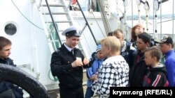 Корреспонденту Крым.Реалии удалось побывать на борту барка и пообщаться с представителями команды судна.