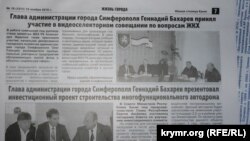 А в продолжение той церемонии вручения на 10-й полосе отдельная статья с заголовком «В администрации города Симферополя состоялось очередное оперативно-хозяйственное совещание под руководством главы городской администрации Геннадия Бахарева». И почти половину статьи составляет перечисление чиновников, которые при этом присутствовали.