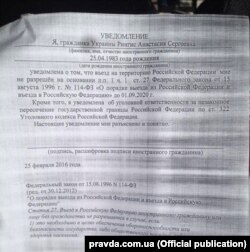 Когда она предъявила паспорт, ее также препроводили к сотрудникам ФСБ на допрос. Однако этим дело не ограничилось, и ей вручили уведомление о запрете на въезд на территорию Российской Федерации до 2020 года. В бумаге, которую ей выдали, указано, что ей нельзя въезжать в Крым «в целях обеспечения обороноспособности или безопасности государства, либо общественного порядка, либо защиты здоровья населения».