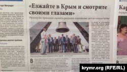 В публикации «Езжайте в Крым и смотрите своими глазами» газета рассказывает о трехдневном визите в Крым французских депутатов. Парламентарии посетили мемориальный комплекс «Красный» под Симферополем, встретились с руководством Крыма, побывали на винзаводе «Массандра», а также посетили французское кладбище и приняли участие в праздновании Дня ВМФ России в Севастополе. Резюмировав впечатления от поездки, глава делегации Тьерри Мариани сказал, что по приезде во Францию будет говорить всем: «Езжайте в Крым и смотрите своими глазами».