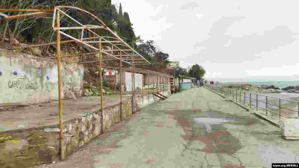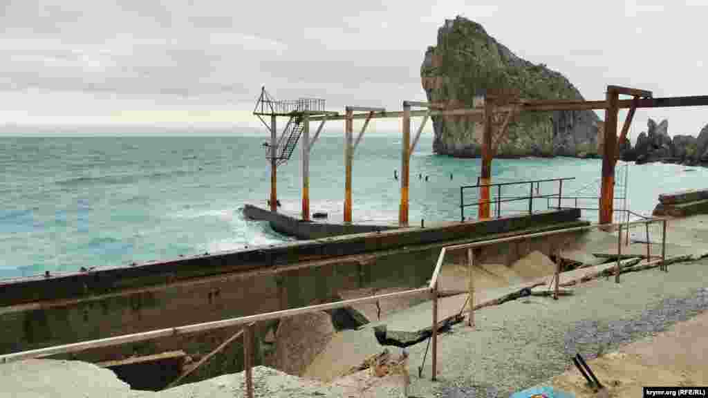 Сломанные железные перекрытия бывших кафе, дыры в асфальте, глубиной в три и более метров, канавы и груды камней на пляже – все, что осталось от набережной в крымском поселке Симеиз. Первый обвал здесь произошел осенью 2015 года. В апреле 2016 подконтрольный России глава Крыма Сергей Аксенов заявлял, что из бюджета республики будет выделено 20 миллионов рублей на ликвидацию провала. Однако работы так и не начались. Нынешней зимой состояние набережной ухудшилось. Теперь она стала опасна для жизни.