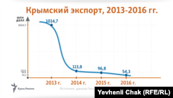 ​Сокращение экспорта начинается с 2014 года, хотя основные международные санкции против полуострова начали действовать только в 2015 году. В частности, в первый год российского контроля над Крымом общий объем экспорта полуострова составил $113,8 млн ($97,9 млн из Крыма и $15,9 млн из Севастополя), сократившись почти в 9 раз в сравнении с 2013 годом. В 2015 году вывоз товаров из Крыма сократился до $96,8 млн, а в 2016 – упал еще на 44%.