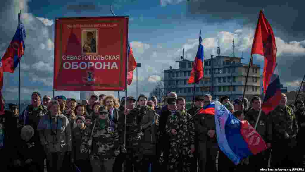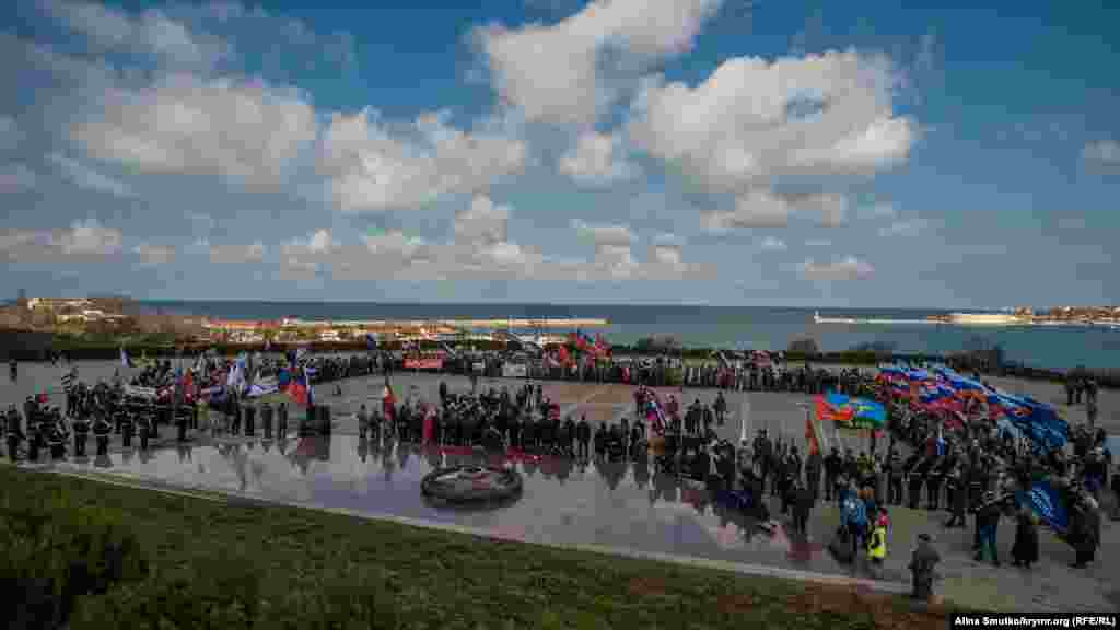 Возле памятника «Солдат и Матрос» в Севастополе прошел митинг, посвященный третьей годовщине «присоединения» Крыма к России. На мероприятии присутствовали местные чиновники, депутаты Госдумы РФ, члены Совета Федерации, а также лидер «путинских» байкеров Александр «Хирург» Залдостанов.
