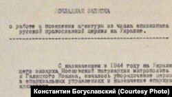 "Докладная записка о работе и поведении агентуры из числа епископата русской православной церкви на Украине" составлена народным комиссаром государственной безопасности УССР генерал-лейтенантом Сергеем Савченко и адресована начальнику 2-го управления НКГБ СССР Петру Федотову. Она датирована 15 января 1946 года и содержит сведения о 7 епископах, трое из которых признаны "ненадежными", а остальные – "честно работающими с нашими органами". В записке, которая, как следует из ее текста, была не единственным документом такого рода, упоминаются только агентурные клички иерархов, однако описанные эпизоды их деятельности и другие детали позволяют с высокой долей вероятности установить личности этих людей. Документ, если верить сделанной на нем пометке, был рассекречен еще в марте 2013 года, однако доступ к нему историки смогли получить только сейчас.