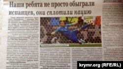 «Крымские известия» в статье под заголовком «Наши ребята не просто обыграли испанцев, они сплотили нацию» пишут о реакции крымских депутатов на победу сборной соседней России над сборной Испании на Чемпионате мира по футболу. «Я орал так, что «посадил» горло. Наверное, наши чувства сплелись в один энергетический ком и «подзарядили» сборную России, – заявил депутат подконтрольного России парламента Крыма Василий Рогатин. – Ребята играли как боги. И, конечно, герой №1 – вратарь Игорь Акинфеев. Как он умудрился в падении ногой отра­зить второй пенальти? Это даже с точки зрения механики и математики невозможно». По словам главы профильного социального комитета парламента Крыма Александра Шувалова, он болел вместе с женой, которая не могла оторваться от экрана. «Хочется от души поблагодарить ребят из российской сборной за праздник. Представляете, с каким настроением после матча к станку станет токарь, а пекарь придет в цех? Да они горы свернут! И в этом тоже непреходящая ценность футбола. Я лично люблю его за зрелищность, силу, виртуозность. Но и за то, что он превращает болельщиков в народ, и даже выше – в нацию», – заявил Шувалов.