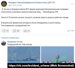 Между тем, в социальных сетях комментаторы начинают сомневаться в могуществе российской армии и флота. Так, в сообществе «Инцидент Крым|Симферополь|Севастополь ДТП ЧП» соцсети «Вконтакте» опубликовано сообщение: «Ночью в Новороссийске ВСУ двумя морскими безэкипажными катерами попытались атаковать военно-морскую базу, – Минобороны РФ. Около 5:10 жители начали слышать громкие звуки в разных районах города. В результате вражеские аппараты были обнаружены и уничтожены. Пострадавших и разрушений нет».