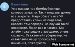 "Уже писали про бомбоубежище, которое закрыто. Так и подвалы домов все закрыты. Надо обязать УК предоставить ключи от подвалов, навести там порядок на случай такой опасности. Люди все в панике. Мы живем тоже рядом с заводами, очень страшно", — отметила она.