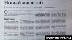 «Крымская газета» в материале «Новый масштаб» пишет о планируемой муниципальной реформе по объединению крымских городов с районами. Уже в ближайший год Красноперекопский район и город Красноперекопск могут объединиться в единый городской округ с сокращением административного аппарата. «Понимая необходимость этого, районные и городские депутаты на общей сессии единогласно поддержали создание единого муниципалитета. И хотя процесс объединения может занять около года, Общественная палата Крыма (подконтрольная России – КР) оценит такую инициативу депутатов и ее перспективы для жителей региона. Если реформа местного управления таким образом будет проведена, то уже в сентябре 2019 года на выборах жители будут выбирать власть для нового муниципалитета», – пишет газета.