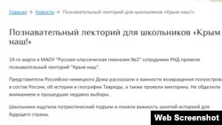 "Представители Российско-немецкого дома рассказали о важности возвращения полуострова в состав России, об истории и географии Тавриды, а также провели викторину. Не обделили вниманием и прошедшие недавно выборы", — пишет автор статьи и добавляет, что "школьники ощутили патриотический подъем и поняли важность занятий историей для будущего страны".
