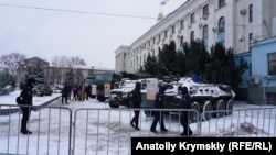 Как сообщает корреспондент Крым.Реалии, возле здание правительства Крыма выставили военную, спасательную, пожарную технику. В частности, представлена 152-миллиметровая гаубица «Мста», боевая машина «Град1», 120-миллиметровый миномет «Сани», различные бронированные машины соответственно 8-го артиллерийского полка и 126-й отдельной бригады береговой обороны российского Черноморского флота из села Перевальное.