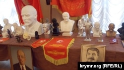 В фойе зала, где проходило мероприятие, устроили выставку портретов и бюстов Ленина и Сталина, также развесили предметы советской атрибутики – флажки и вымпелы. Сообщается, что экспонаты предоставил частный коллекционер.