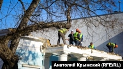 В Симферополе 21 февраля приступили к демонтажу кровли и стен подсобных помещений Театра кукол. Как сообщает корреспондент Крым.Реалии, занимаются сносом рабочие строительной фирмы «Меандр» из Санкт-Петербурга. Работы производятся вручную, с помощью кирки, лопат, ломов.