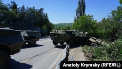 В Крыму, неподалеку от Симферополя, 14 мая российский военный бронетранспортер, который буксировал на жесткой сцепке неисправный бронетранспортер, стесал несколько десятков метров отбойника объездной ялтинской трассы.