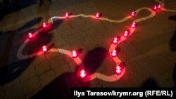 Организаторы акции расставили пластиковые стаканчики по контуру карты России и аннексированного Крыма в ее составе. Полуостров был выложен свечами в красных лампадках.