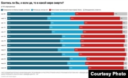 О страхе смерти в разные годы сообщают от 30 до 40% опрошенных, совершенно не боятся или скорее не боятся от 36 до 51% граждан, прочие отвечают: "иногда – да, иногда – нет" или не знают, что сказать.