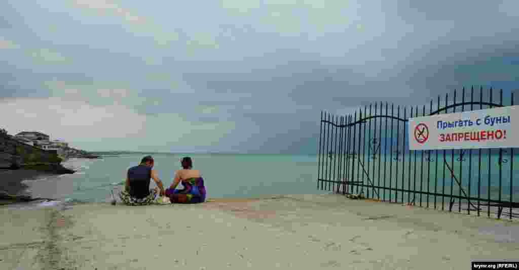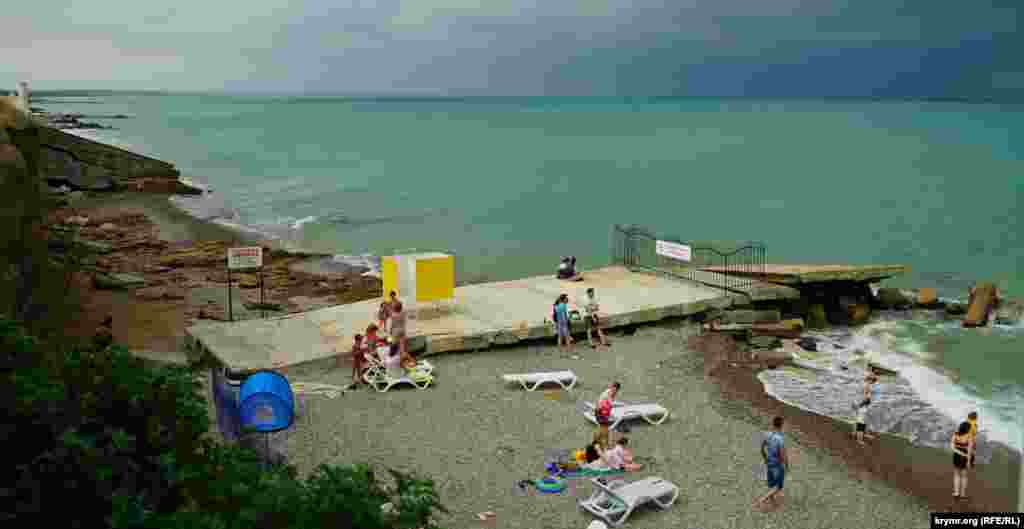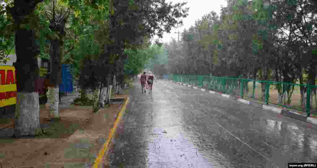 Поселок Николаевка Симферопольского района накрыли ливни. Пока грозовая туча стояла над морем, отдыхающие доедали кукурузу и делали фотографии. А после, укрывшись зонтами и пляжными полотенцами, покинули пляж.