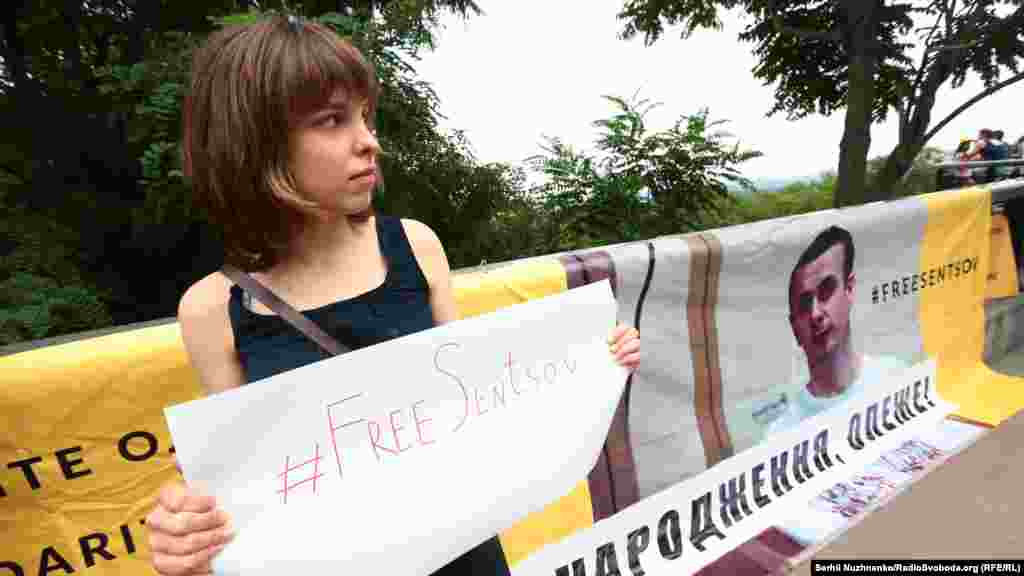 Ко дню рождения крымского кинорежиссера Олега Сенцова в Киеве провели акцию-поздравление. Активисты собрались в Мариинском парке, чтобы поздравить украинского политзаключенного с 41-м днем рождения.