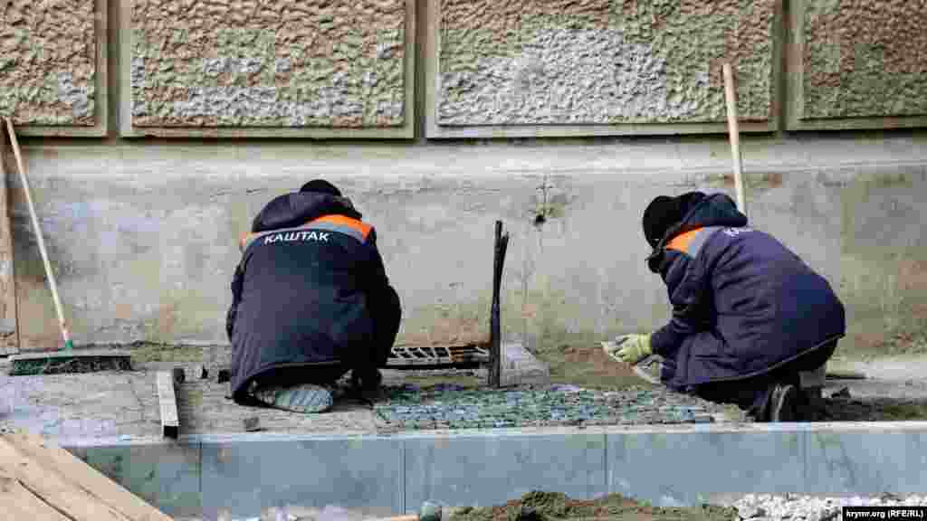 В Евпатории полным ходом идет реконструкция города. На улице укладывают новую плитку, ведут ремонт исторических зданий и других учреждений. На набережной города также проводят строительные работы. Город готовится к предстоящему туристическому сезону.