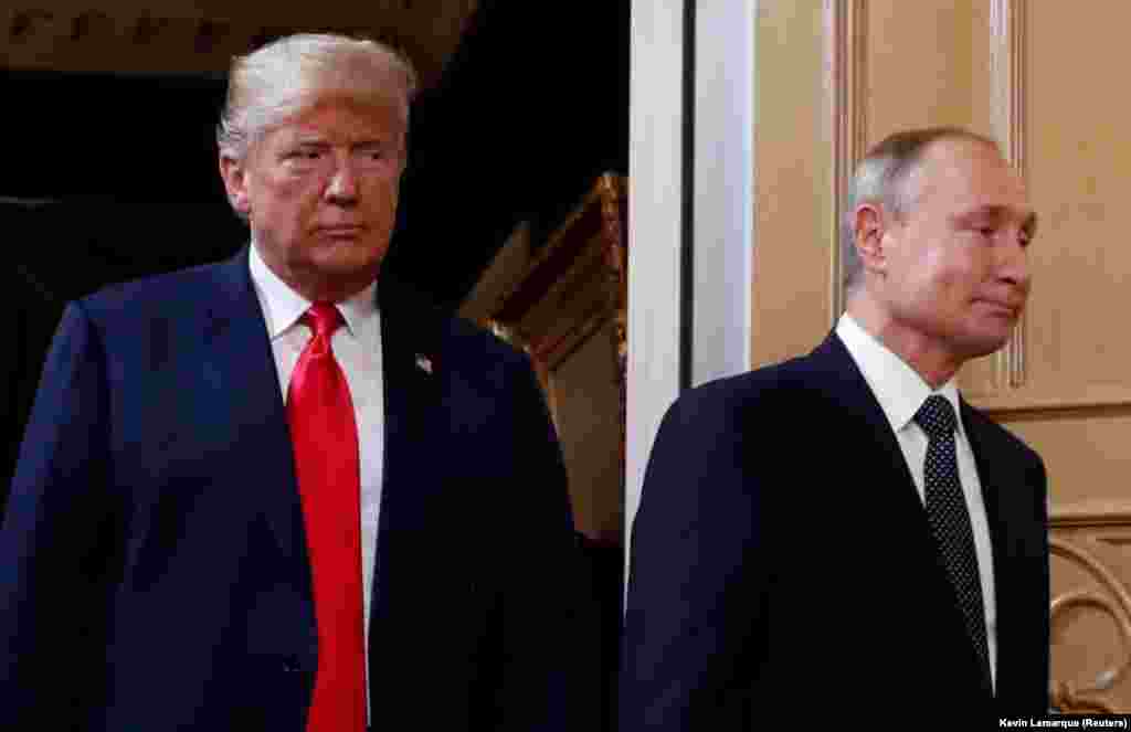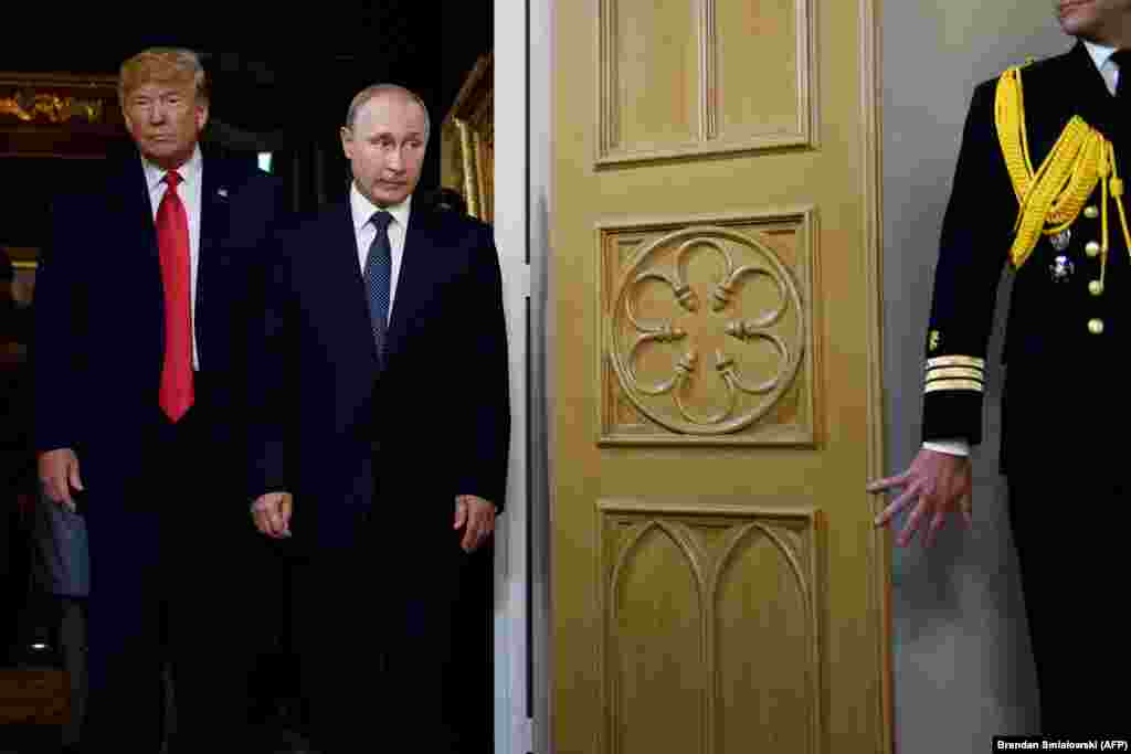 Президент США Дональд Трамп и президент России Владимир Путин обратились к журналистам перед встречей тет-а-тет, которая из-за опоздания российского президента началась почти на час позже.