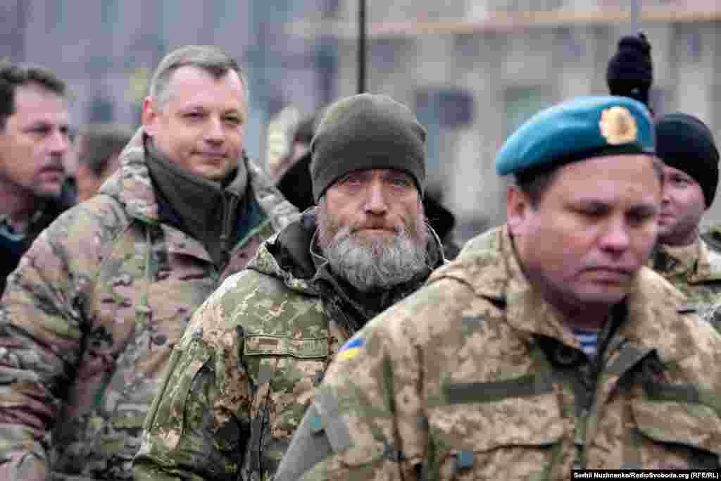 На центральной улице Киева собрались ветераны боевых действий на востоке Украины, участники обороны Дебальцевского плацдарма, чтобы маршем почтить вторую годовщину боев за Дебальцево