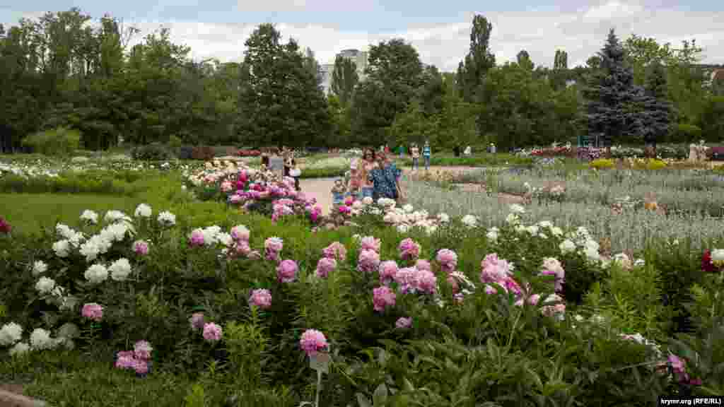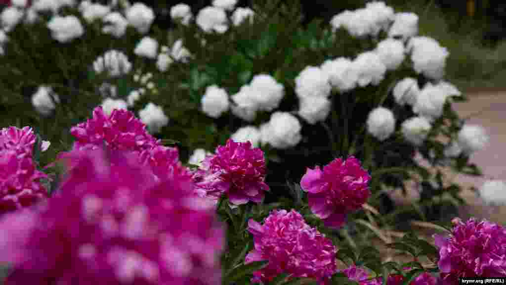 В Симферополе в ботаническом саду ТНУ им. Вернадского цветут белые, розовые и красные пионы. Горожане и гости города пришли полюбоваться цветами и сфотографироваться с ними.