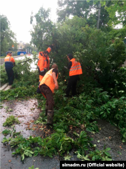 Сотрудники коммунальных служб ликвидируют последствия ливня в Симферополе, 29 мая 2021 года