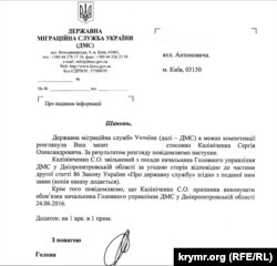 Крым.Реалии стали известны другие страницы биографии украинского экс-чиновника. Нам удалось получить подтверждения, что Сергей Калиниченко действительно возглавлял главное управление Госмиграционной службы в Днепропетровской области. Документы на конкурс он подал весной 2015 года и дал разрешение на проведение в отношении него проверки, предусмотренной законом об очищении власти. Этот закон, напомним, устанавливает 10-летний запрет на занятие должностей во власти для тех, кто работал в команде беглого президента Украины Виктора Януковича. Проверка в отношении Калиниченко проводилась в мае 2015 года.