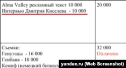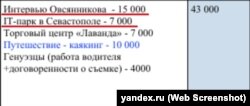 Еще в одном документе указаны суммы гонораров за конкретные публикации. Из него следует, что неоплаченными остаются интервью с российским губернатором Севастополя Дмитрием Овсянниковым (15 тысяч рублей) и материал об инвестпроекте по созданию технопарка «ИТ-Крым» в Севастополе.