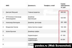 В обнародованной Дмитрием Жмуцким сетке задолженности самые крупные суммы значатся у него самого, а также дизайнера-верстальщика (422 тысячи рублей), дизайнера-фотографа (351,6 тысячи рублей), автора текстов и видео (164 тысячи рублей) и дизайнера-графика (130 тысяч рублей). У остальных сотрудников суммы долга меньшие и исчисляются десятками тысяч рублей.