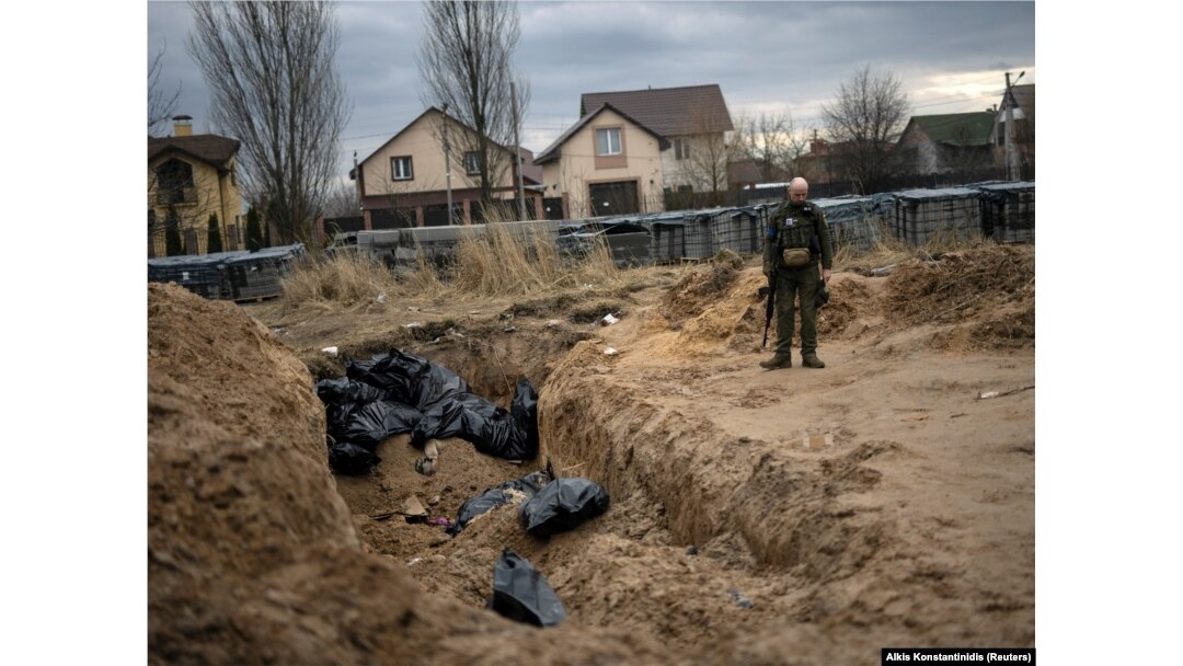 На снимке от 6 апреля украинский военный стоит у братской могилы с телами мирных жителей, погибших во время оккупации Бучи